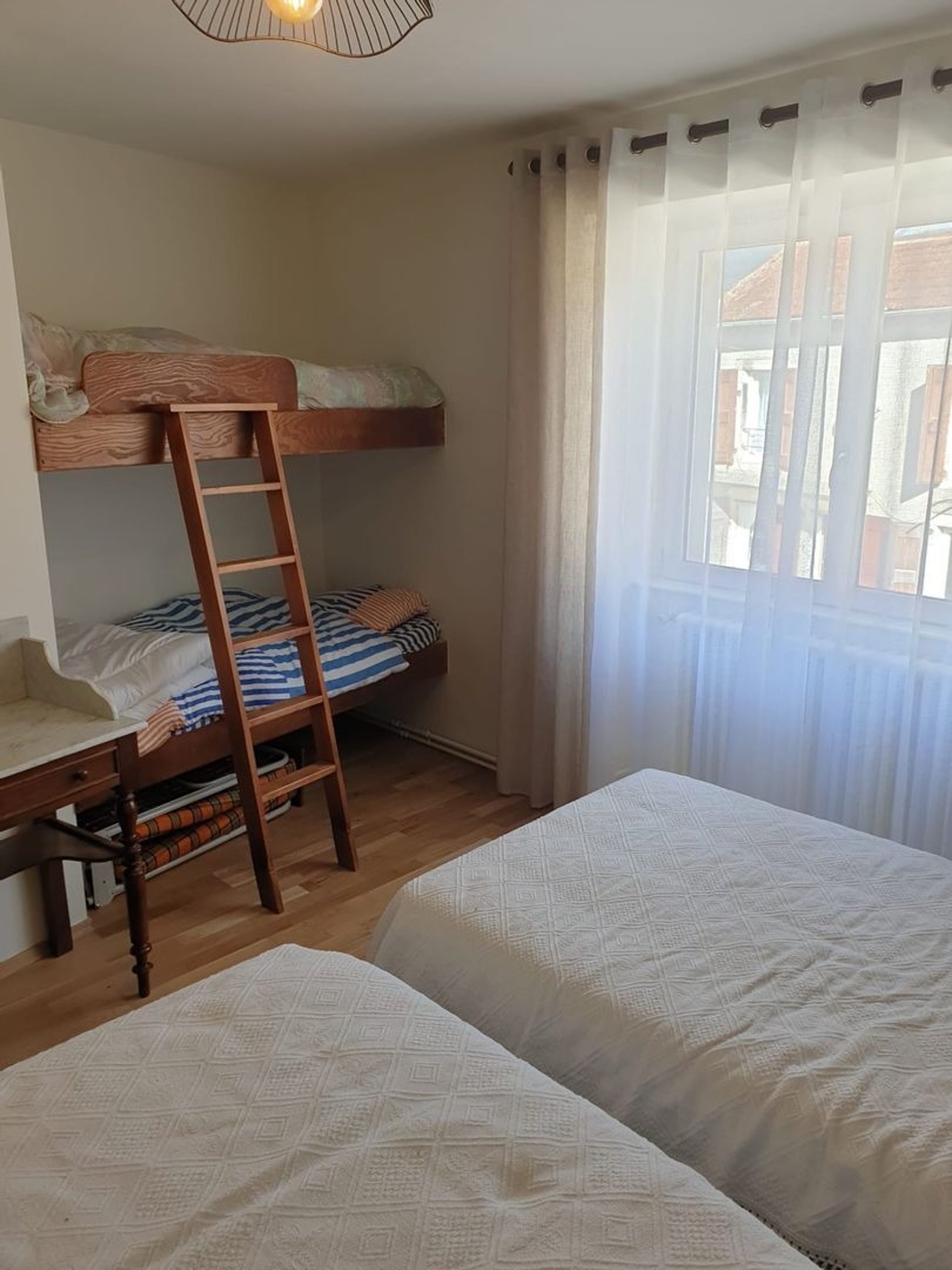 - au second étage d’une chambre avec un lit double, d’une seconde chambre avec deux lits simples ainsi que de deux lits superposés pour enfant. Et enfin d’une salle de bain avec une belle douche et des toilettes.